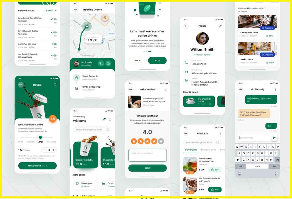 Modern iOS User Interface design template for a Coffee shop app. This template is ideal for a Caffe, coffee order, coffee delivery app, beverages app, and any coffee shop app. Make your app design looks stunning and eye-catching using this template. This template includes 15 unique and modern User Interface screens in PSD and Figma format. You can edit and customize easily using Adobe Photoshop and Figma.
